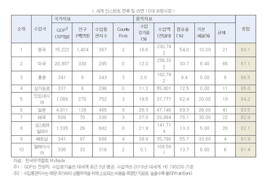 AI가 주요 58개국의 9개 지표를 종합해 분석한 결과 인스턴트 면류 및 라면의 수출 잠재력이 가장 높은 시장은 중국 93.1점, 미국 87.1점, 홍콩 86.5점 순이었다. 중국의 수입증가율은 18.6%, 수입시장 점유율은 54%, 수입액은 2억 3,074만 달러(한화 약 2,508억 원)를 기록하며 가장 유망한 시장으로 평가됐다.
