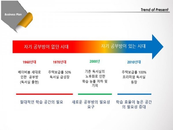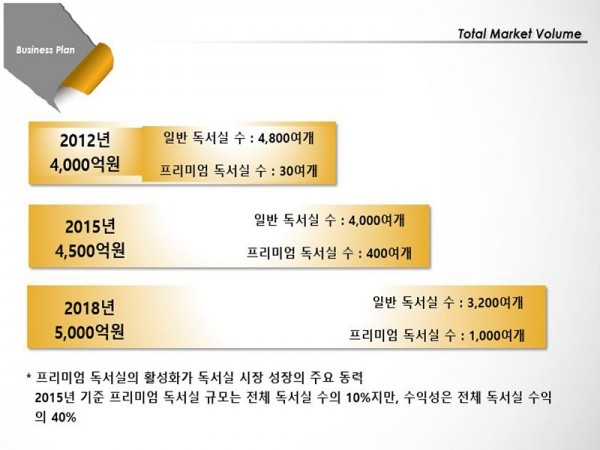 일반독서실과 프리미엄 독서실의 시장규모 이미지를 제공하고 있는데 프리미엄 이미지의 특성, 기능에 대해서도 같이 기술하면 이해도가 높아질 듯 하다.