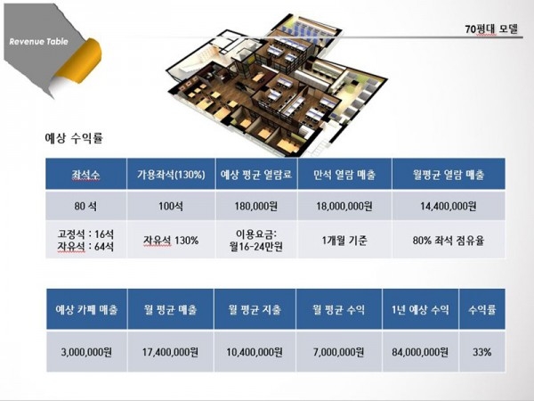 제시한 자료의 예상수익률은 사업전체의 수익률이 아니라 한 매장 사례의 예상수익률이다. 제시한 수익률 33%는 매우 높다. 이 수익률 산출근거에서 총투자수익률 또는 투하자본수익률 또는 순투자수익률인지 구체적으로 제시하지 않고 있다. 이 예상수익률은 건물임대료를 제외한 총설비투자에 대한 수익률인 것으로 보인다.