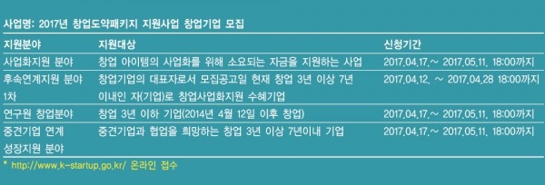 2017년 지원규모는 500억 원이다. 창업기업 1,000개사 내외를 지원하며, 지원대상은 창업 3년 이상 7년 미만 기업이다. 지원분야 및 지원대상, 신청기간은 다음과 같다.