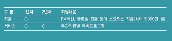 비즈니스모델 혁신 및 글로벌 진출 등에 소요되는 사업화자금으로 최대 5,000만 원과 특화프로그램의 서비스를 지원한다.2017년 상반기에는 350개사 이내의 창업기업을 선정할 예정이며, 신성장동력분야의 창업기업을 20% 이상 선정한다.