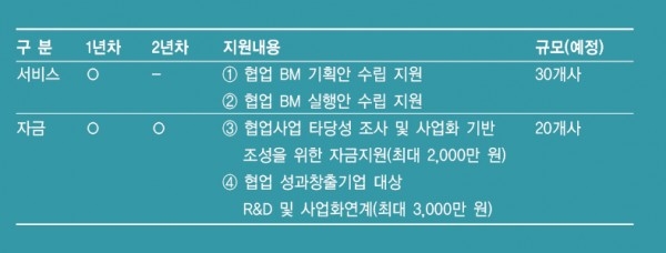 중견기업과 창업기업 간 기술이전, 공동개발 등 협업을 통한 기업의 성장 견인 및 협업사업화 지원을 위한 사업으로 협업 BM(비즈니스모델) 수립지원 등 서비스 및 자금을 지한다. 자금은 서비스 지원 수혜자 중 심층평가를 통해 20개사 내외의 지원기업을 선정한다. 신성장동력분야 창업기업을 20% 이상 선정하게 되어 있다.