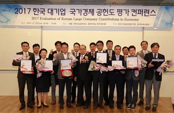 (사)한국기업공헌평가원(이사장 이종천)과 (사)한국M&A협회(회장 김익래)는 지난 27일 ‘2017 한국 대기업 국가경제 공헌도 평가 컨퍼런스’에서 이같은 내용을 발표했다. 지난 2016년 자산 규모 5조원 이상인 기업 집단의 사업보고서를 분석한 결과이다.