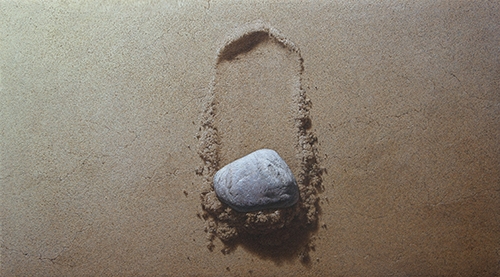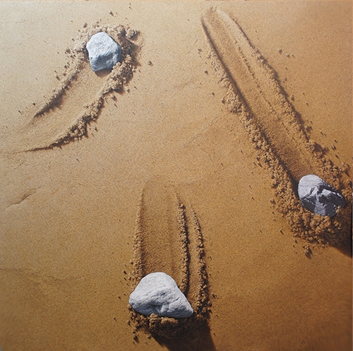이런 위기감일까? 작가 윤위동이 근자에 작업하는 ‘자취’ 시 리즈는 그의 인생을 꼭 담고 있는듯하다. 평평한 모래밭에 쭉 밀려 모래표면을 훑고 지나온 흔적을 남긴 커다란 돌덩이 를 그린 이 작업들은 짧지만 큰 존재감을 가진 원래 위치에 서 이동하여, 다시 위치를 잡고 있는 그의 현재 모습과 너무 나도 일치한다. 왜 모래밭에 돌을 그리냐는 질문에 “많은 모래알갱이들과 커다란 돌덩이가 원류는 하나잖아요. 이 많은 모래알갱이들이 저 돌맹이에서 나온 것이고, 이 모래알갱이가 다시 열과 압력에 의해 또 다시 돌이 되는 것처 럼 윤회라는 삶의 순환을 표현해보고 싶었어요.”