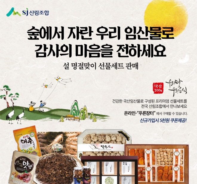 산림조합은 "이번 설 명절을 맞아 우리 임산물 특별 기획전에는 곶감, 나물류, 버섯류, 견과류, 더덕·, 수삼류 등 건강한 우리 임산물 선물셋트로 시중보다 저렴한 가격과 대량 구매 할인 등 행사를 하고 있다"고 말했다.